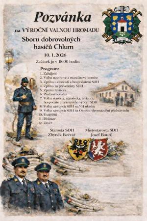Sboru dobrovolných hasičů Chlum zve 10. ledna 2026 od 18:00 hodin na VÝROČNÍ VALNOU HROMADU.