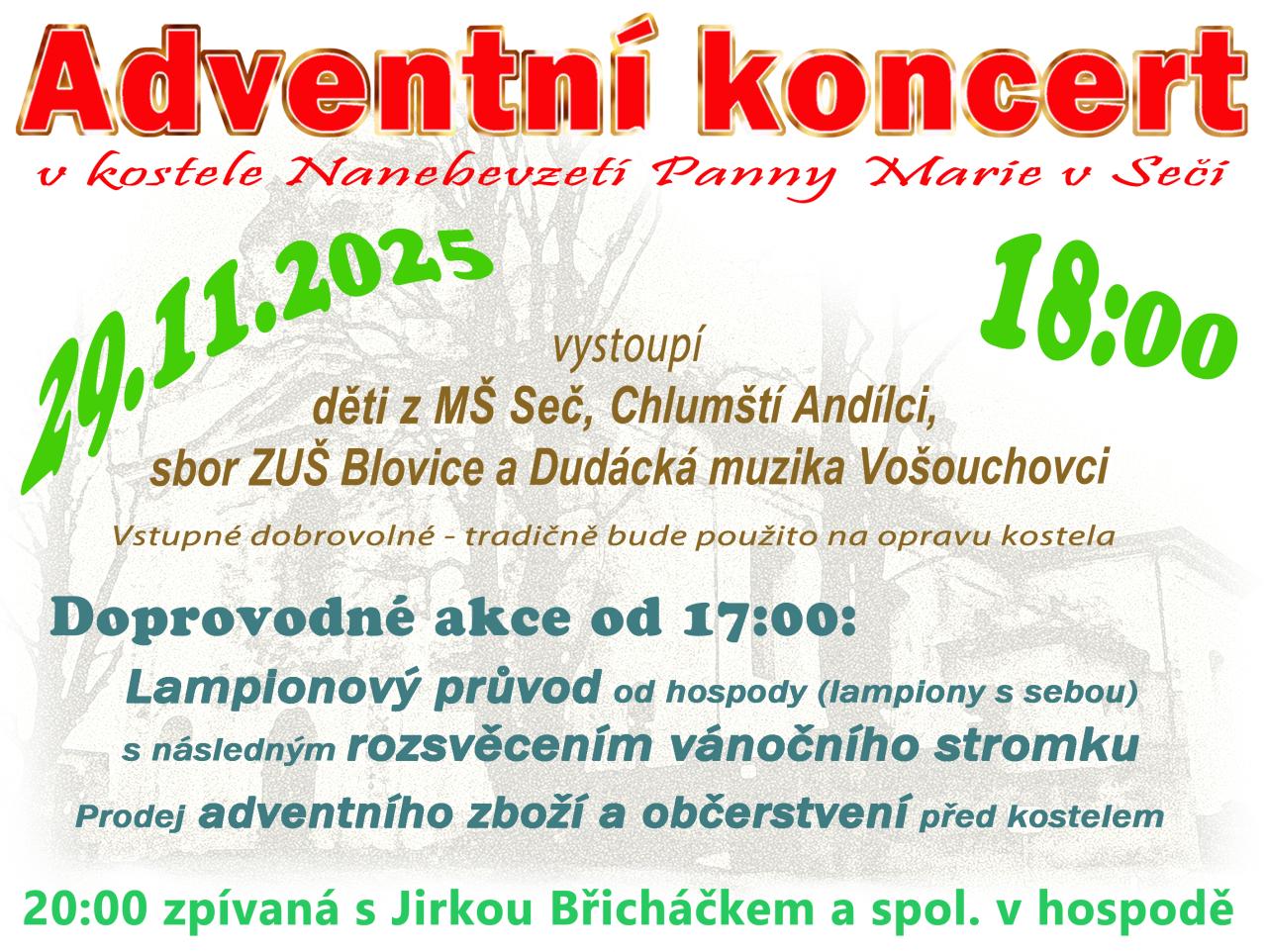 V sobotu 29. listopadu 2025 se v kostele Panny Marie v Seči uskuteční adventní koncert. Na programu vystoupí děti z mateřské školy Seč, Chlumští Andílci, sbor ZUŠ Blovice a Dudácká muzika Vošouchovci. Vstupné je dobrovolné a výtěžek bude tradičně použit na opravu kostela. Doprovodné akce začnou již od 17:00, kdy se uskuteční lampionový průvod od hospody a následné rozsvícení vánočního stromku. Před kostelem bude také probíhat prodej adventního zboží a občerstvení. Akce vyvrcholí ve 20:00 zpívanou s Jirkou Břicháčkem a spol. v hospodě.