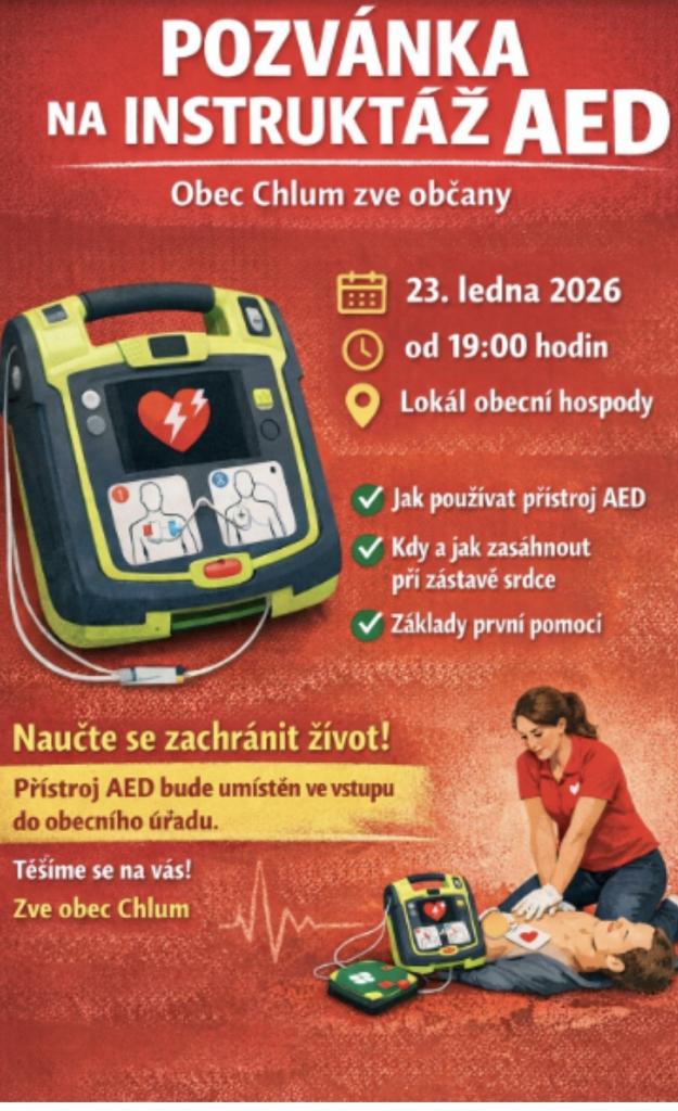 Obec Chlum zve všechny občany na instruktáž o používání přístroje AED, která se koná 23. ledna 2026 od 19:00 hodin v lokále obecní hospody. Účastníci se dozvědí, jak správně používat defibrilátor a jak zasáhnout při zástavě srdce. Akce je zaměřena na základy první pomoci, což může v krizových situac