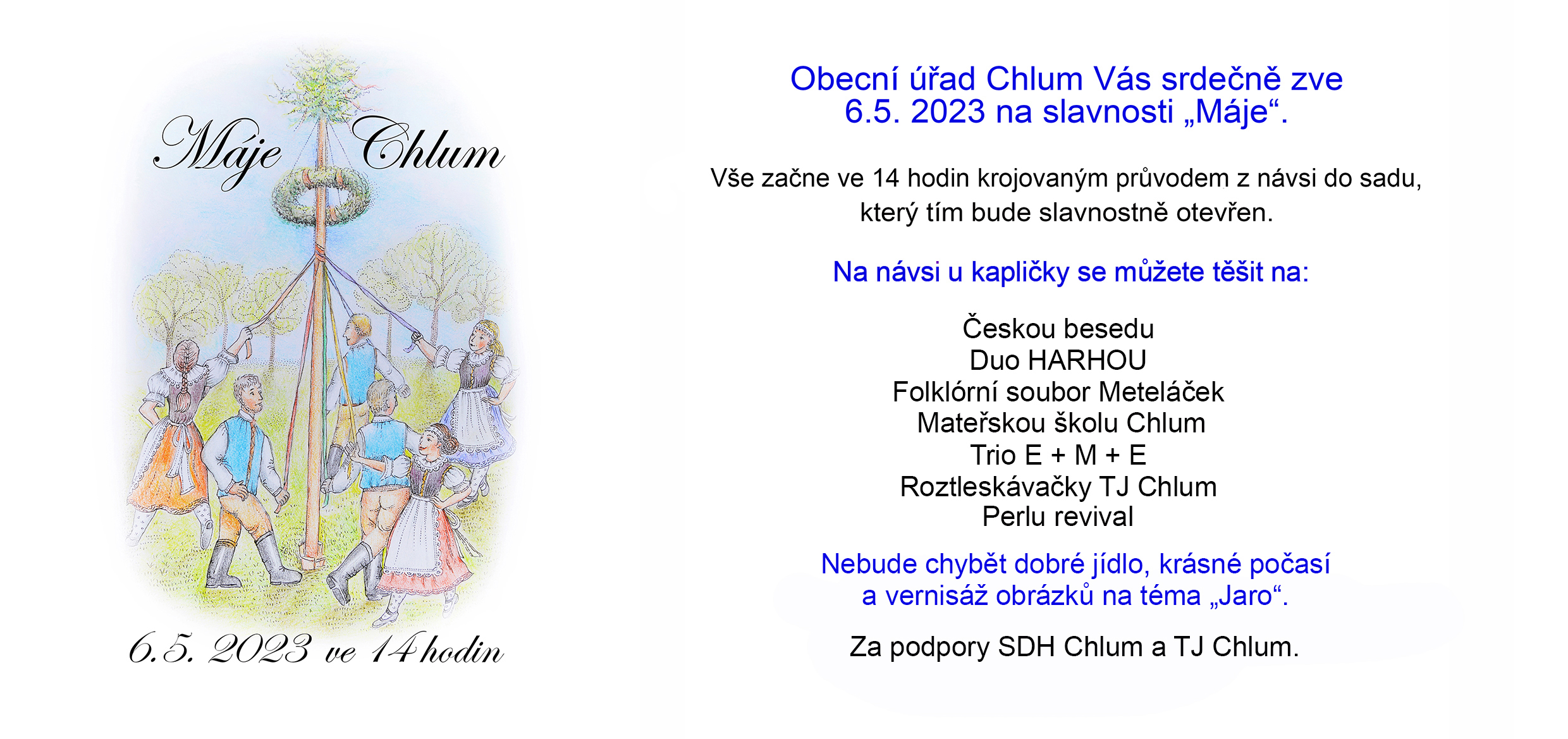 Dne 6.5.2023 se uskuteční v obci Chlum již tradiční slavnosti "Máje". Máje s ČESKOU BESEDOU, folklorní soubor Meteláček, duo HARHOU, MŠ Chlum, Perla revival....