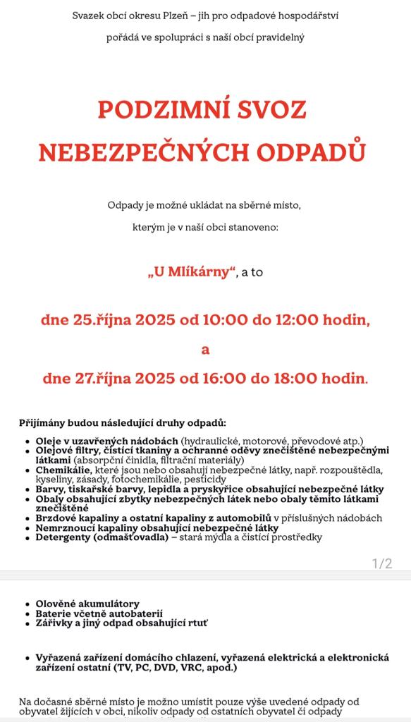 Svazek obcí okresu Plzeň-jih ve spolupráci s naší obcí pořádá podzimní svoz nebezpečných odpadů. Sběrné místo je stanoveno na 'U Mlíkárny', kde budou odpady přijímány 25. října 2025 od 10:00 do 12:00 a 27. října 2025 od 16:00 do 18:00. Akce je určena pouze pro obyvatele naší obce. Mezi přijímané odpady patří oleje v uzavřených nádobách, chemikálie, barvy, baterie a další specifikované druhy. Prosíme, aby občané dodržovali stanovená pravidla a přinášeli pouze vyjmenované odpady.